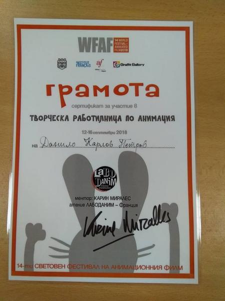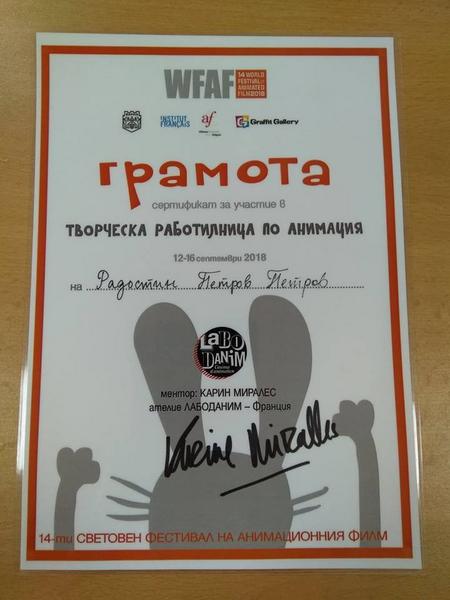 Четиринадесето издание на Световен фестивал на анимационния филм Варна 2018Награждаване на най-малките участници в детското анимационно ателие на Четиринадесето издание на Световен фестивал на анимационния филм Варна 2018. Децата създадоха свой собствен съвместен анимационен филм "Уши на колела"/ "Ears on wheels", който бе прожектиран на широк екран...!!! Адмирации за упорития труд и проявеното търпение. |